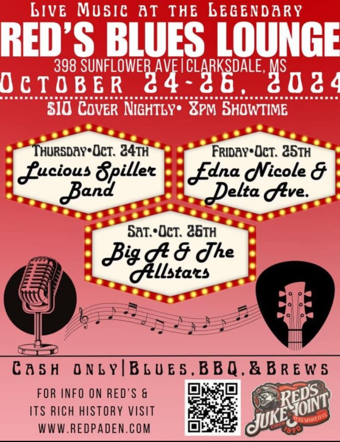 Clarksdale, Mississippi – Clarksdale, Mississippi, known for its rich blues heritage, will be buzzing with excitement as Red’s Blues Lounge, located at 398 Sunflower Avenue, gears up for a weekend of live performances from October 24–26, 2024.
