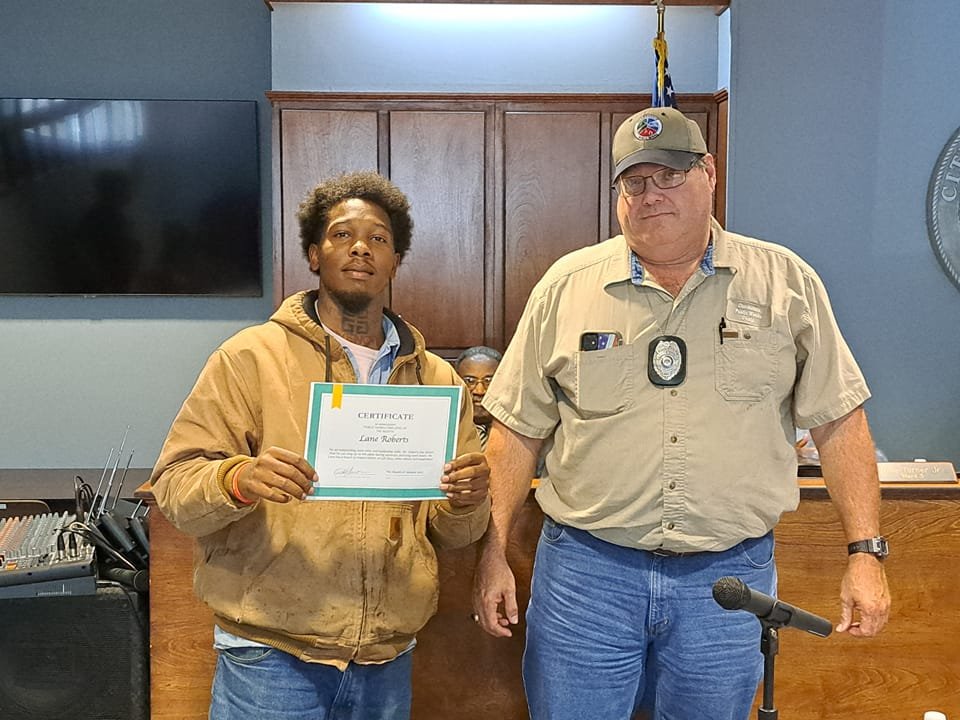 Roberts thanked Assistant Director of Public Works Craig Amerson, whom he calls “Coach,” for the opportunity. “I want to thank Coach for giving me the opportunity to be better at what I’m doing,” Roberts said. “I’m young, so I want to be the face of the young that’s coming up. I want to make a career out of public works and give the kids another option.”