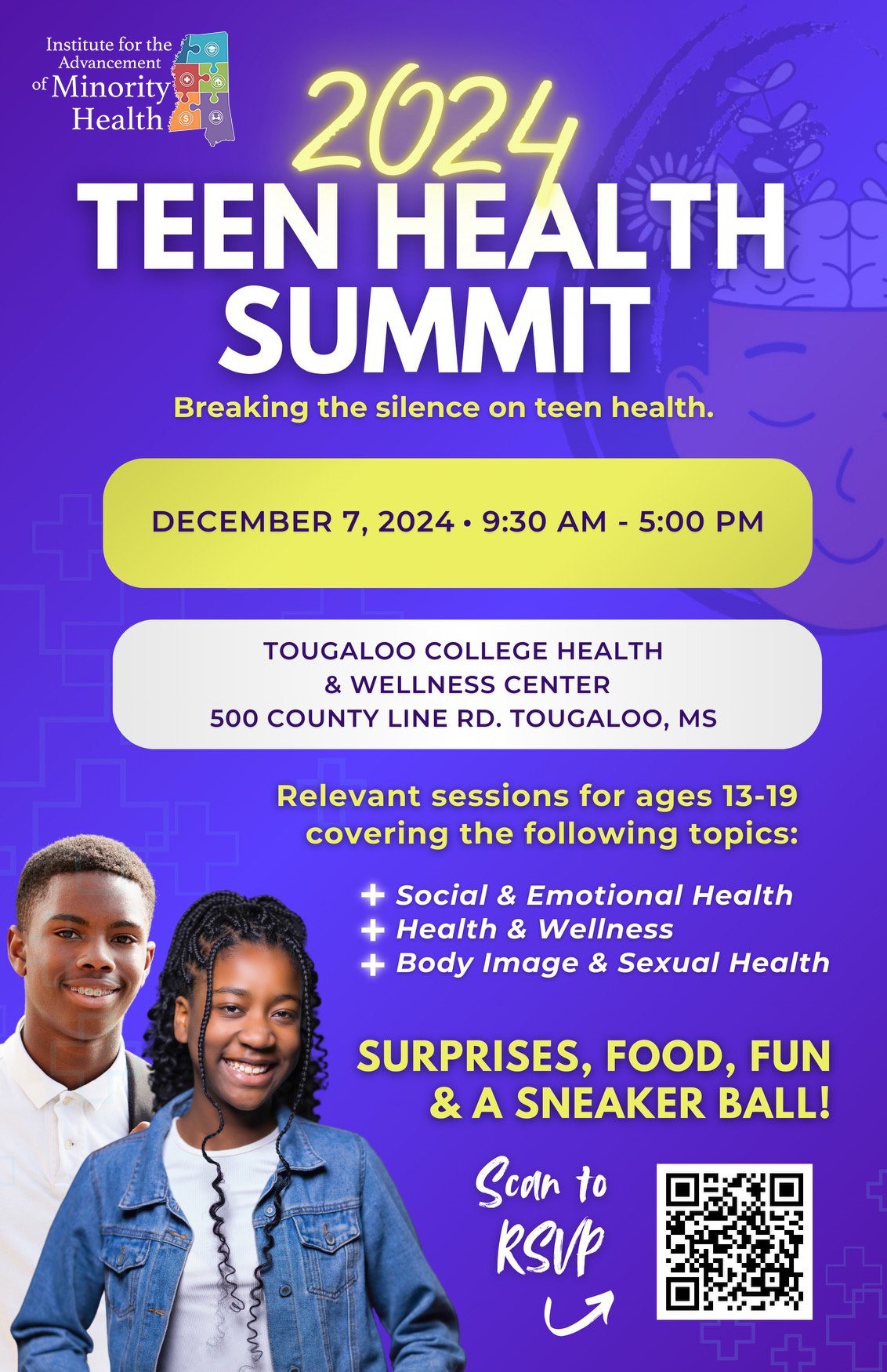 Jackson, MS (November 7, 2024)—The Institute for the Advancement of Minority Health will host its Inaugural Teen Health Summit at 9:30 a.m., Saturday, December 7, 2024, at Tougaloo College. This one-day event, designed and led by local teens, will feature workshops, interactive sessions, and discussions tailored to support the well-being of today’s youth. The summit will conclude with a Sneaker Ball.