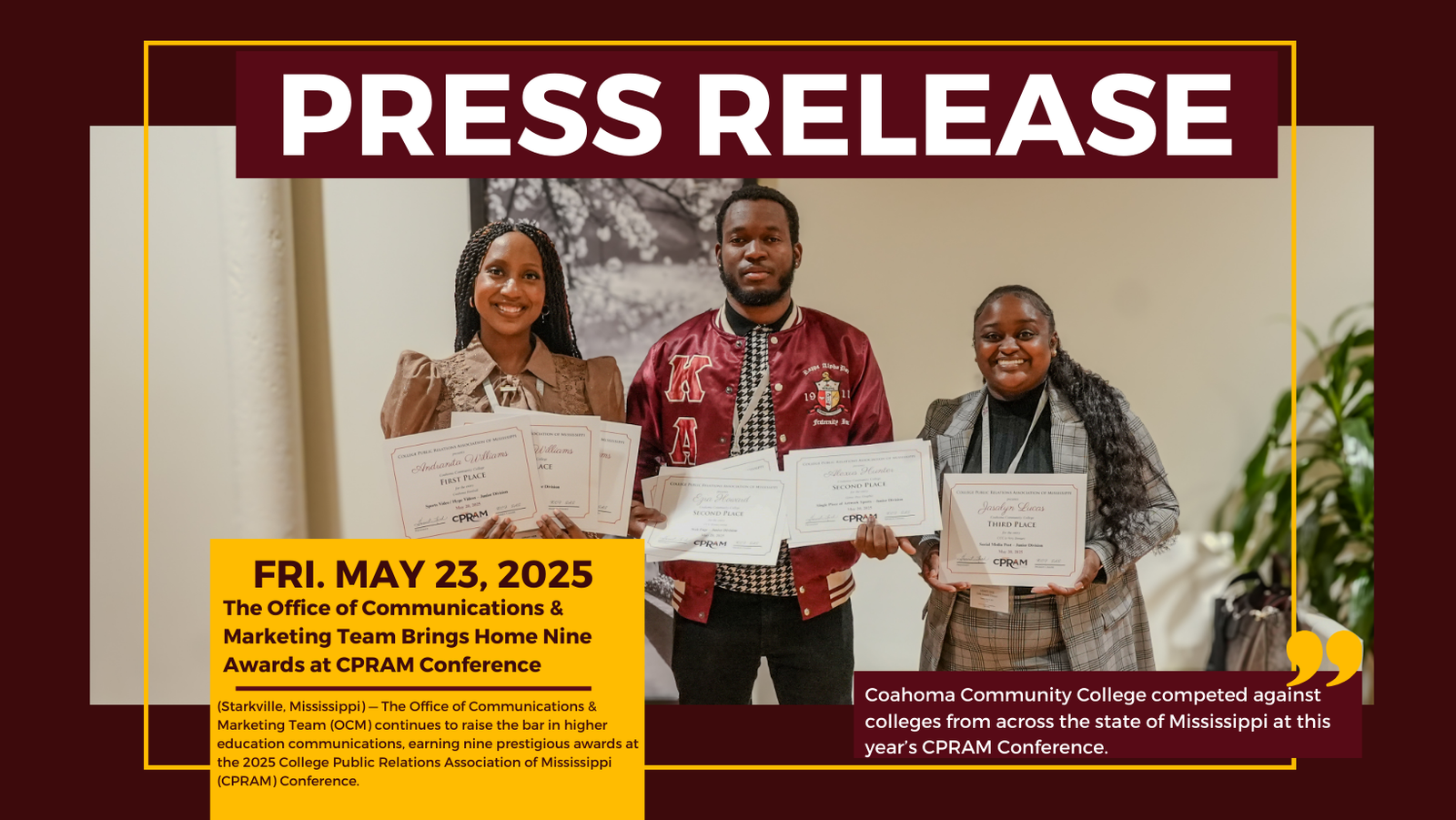 (Starkville, Mississippi) — The Office of Communications & Marketing Team (OCM) continues to raise the bar in higher education communications, earning nine prestigious awards at the 2025 College Public Relations Association of Mississippi (CPRAM) Conference. The annual conference showcased the best in marketing, public relations, and media production from colleges and universities across the state.