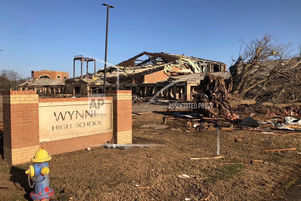 Stunned residents of Wynne, a community of about 8,000 people 50 miles (80 kilometers) west of Memphis, Tennessee, woke Saturday to find the high school’s roof shredded and its windows blown out. Huge trees lay on the ground, their stumps reduced to nubs. Broken walls, windows and roofs pocked homes and businesses.