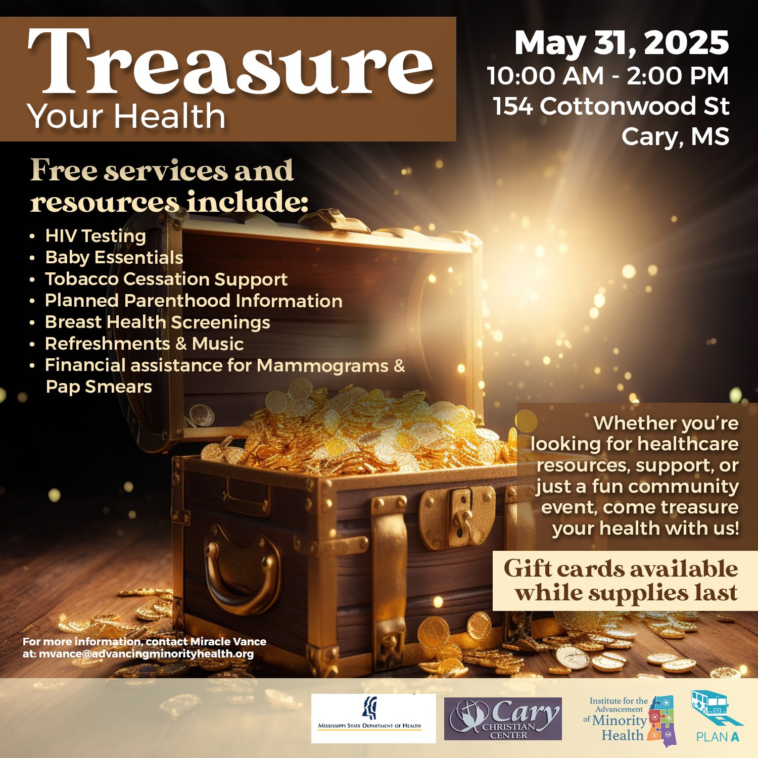 Jackson, MS (May 8, 2025) – In celebration of National Minority Health Month, Cary, MS, residents are encouraged to attend the Treasure Your Health Wellness Fair on Saturday, May 31, 2025, from 10 a.m. to 2 p.m. at the Cary Christian Center. Cary Christian Center is located at 154 Cottonwood Street, Cary, MS.